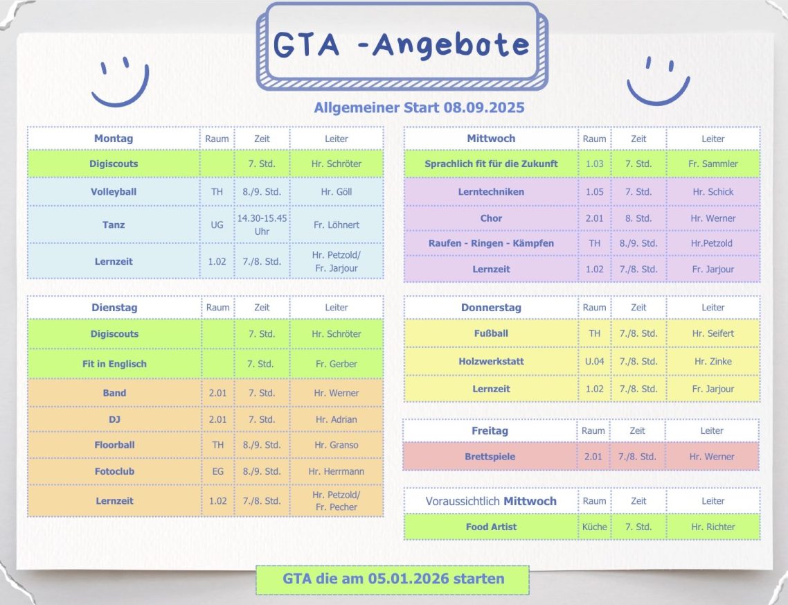 Unsere Ganztagsangebote sind eine wichtige Initiative, um Schülerinnen und Schülern eine ganzheitliche Bildung zu ermöglichen. Diese Programme bieten nicht nur zusätzliche Unterrichtseinheiten, sondern auch vielfältige Freizeitaktivitäten, die das soziale und persönliche Wachstum fördern. Durch sportliche Aktivitäten, kreative Workshops und Förderkurse können die Kinder ihre Talente entdecken und entwickeln.